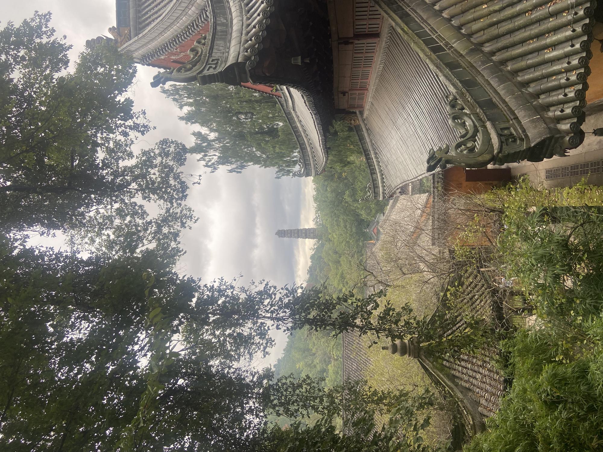 中午一点,我们终于抵达天台县城,找了家本地菜馆,点上天台香鱼、糊拉汰,热乎的饭菜驱散了雨天的微凉。饭后雨势渐小,空气中满是湿润的草木香,我们沿着青石板路走向国清寺。远远便看见隋塔矗立在山腰,塔身爬满青苔,像一位沉默的老者守护着千年古刹。