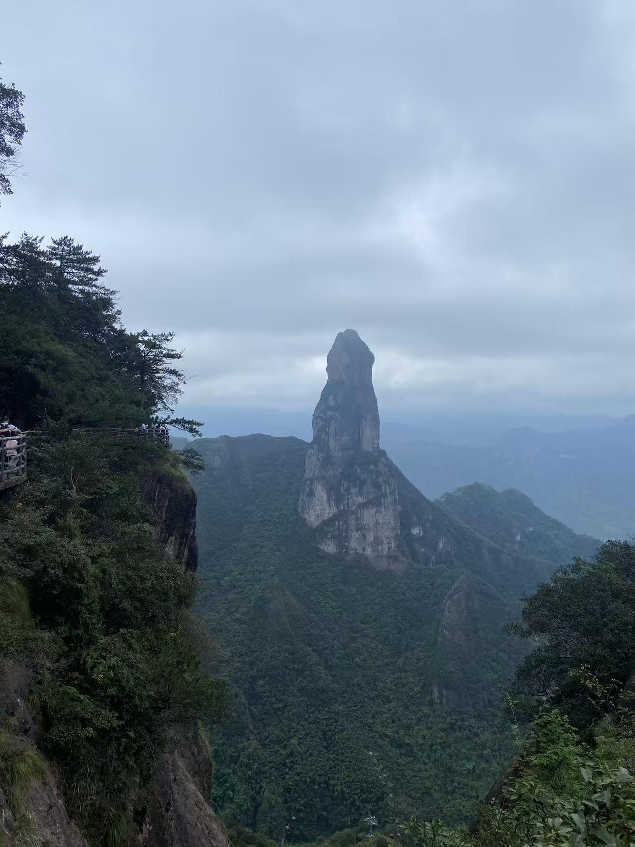 下了缆车,再乘天梯直上南天顶,我们沿着步道前行。今日气温凉爽,二十来度的天气最适合登山,脚下的石阶不算陡峭,两旁的灌木丛中不时冒出几朵不知名的野花。走过南海桥→莲花台→望峰台,众人纷纷驻足——有爱好摄影队友纷纷停下脚步拍照,队伍散成三三两两的组合,各自欣赏着沿途美景,边走边看,当前方出现一突兀的像手撑伸出的岩石时,有队友说,这就是天柱峰也叫观音峰,它形似双手合十虔诚膜拜的观音而得名,是神仙居“六大奇观”之一,周围群山环绕,植被茂密,云雾天气时更显空灵仙境之美。